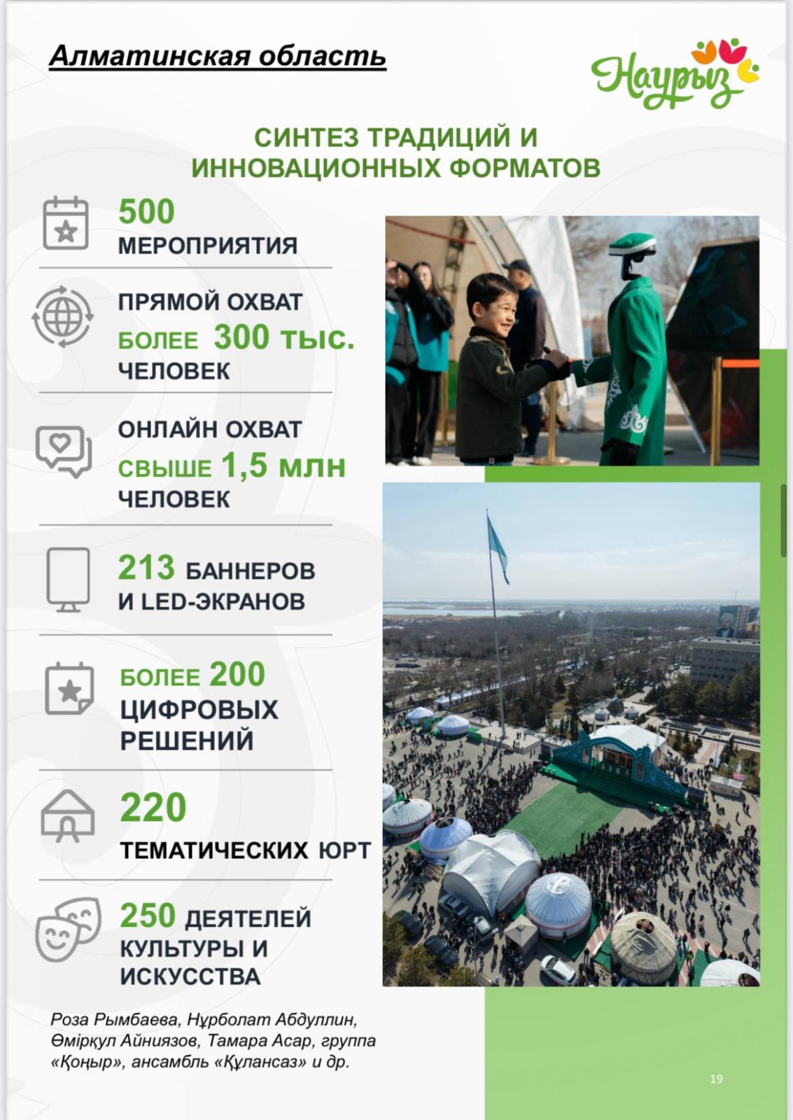 В Алматинской области подвели итоги празднования Наурыза, сделав ставку на инновационные форматы. В регионе организовали 500 мероприятий, внедрив более 200 уникальных цифровых решений для гостей. Праздник вживую посетили свыше 300 тысяч человек, а интерес в сети оказался колоссальным онлайн-охват превысил 1,5 миллиона пользователей. На территории области установили 220 тематических юрт, а культурную программу обеспечили 250 артистов, включая Розу Рымбаеву, Нурболата Абдуллина и ансамбль «Құлансаз», создав уникальное сочетание народного колорита и современных технологий.
